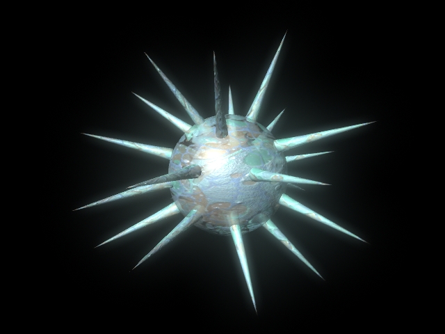 I like number 4 - some great surface detail there; I would suggest taking out some of the blueish glow and going for something slightly less 'angelic' in terms of colour; obviously the spikes scream 'VIRUS!' but there's just something about the softness and pearly light that makes it seem more benign than perhaps it should? Does the whole thing need to go more greenish?
